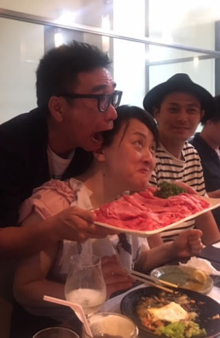 もうおいしそうなお肉を前に興奮してふざけています。